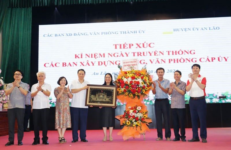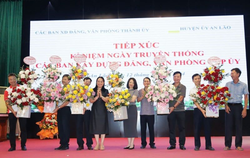 Nhân dịp này, lãnh đạo các Ban Xây dựng Đảng của Thành ủy tặng quà lưu niệm Đảng bộ huyện An Lão. Lãnh đạo Huyện ủy An Lão trao các bó hoa tươi thắm chúc mừng các cơ quan tham mưu, giúp việc của Thành ủy nhân kỷ niệm 94 năm ngày truyền thống.