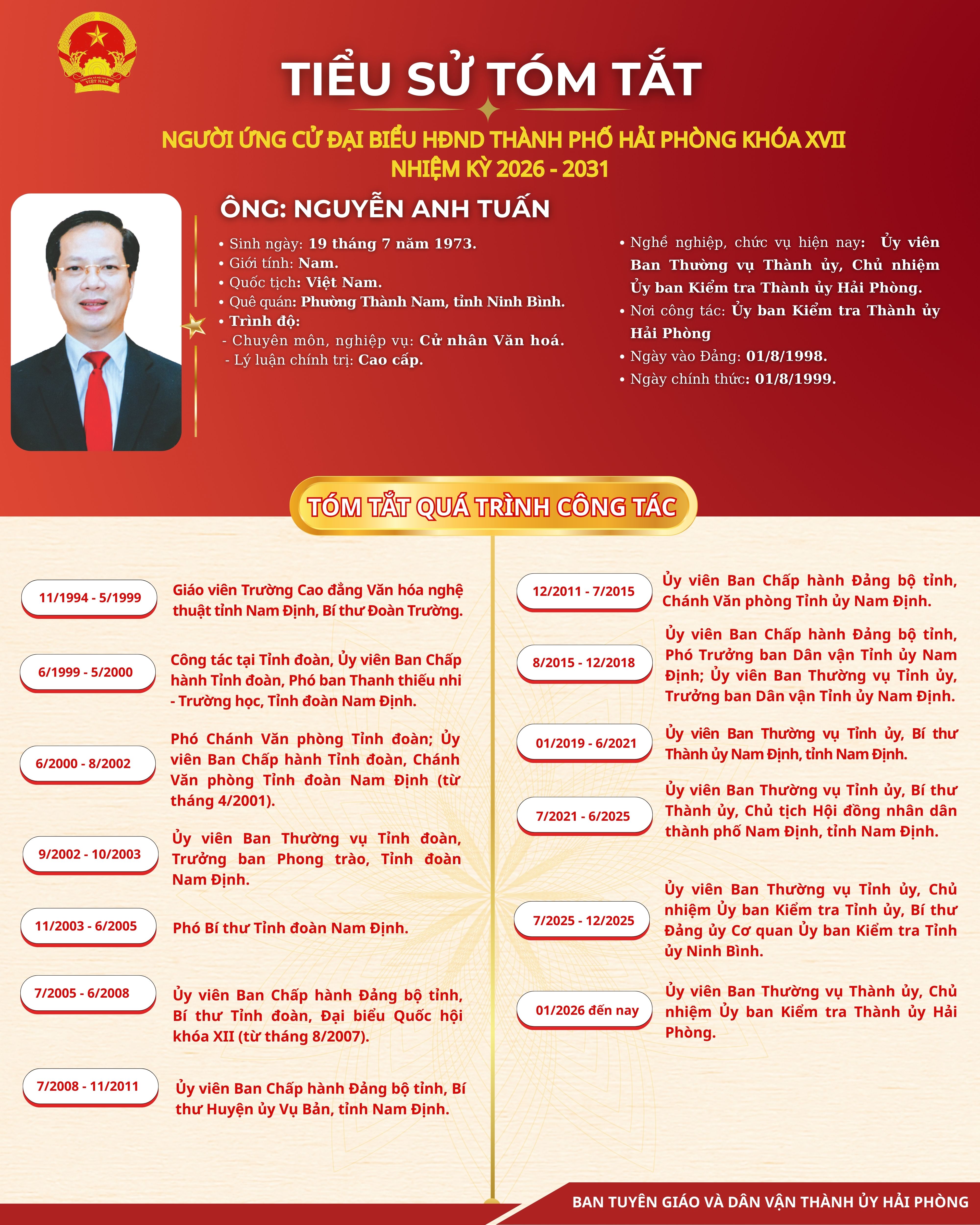 Đồng chí Nguyễn Anh Tuấn, sinh ngày 19/7/1973; Trình độ chuyên môn: Cử nhân Văn hoá; Cao cấp Lý luận chính trị; Tiếng Anh trình độ B. Trải qua hơn 30 năm công tác liên tục trong hệ thống chính trị, Đồng chí được rèn luyện, trưởng thành từ cơ sở, kinh qua nhiều lĩnh vực công tác khác nhau.